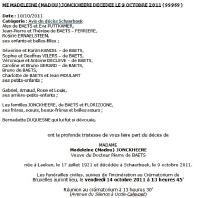 Familie | Madeleine (Madou) Jonckheere °. 17 Jul 1921, +. 9 Okt 2011 |