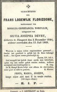 Frans (Franciscus) Lodewijk (Louis Ludovicus) Florizoone was Kleermaker. Hij werd geboren op vrijdag, 5 november 1824 te Nieuwpoort. Hij huwde Rosalia Constantia Norullie (Norulle), dochter van Engelbertus Ludovicus Norullie (Norulle) en Maria Cecilia Teyhus, op 20 juni 1855 te Nieuwpoort. Frans (Franciscus) Lodewijk (Louis Ludovicus) Florizoone huwde Sylvia Josepha Devry, dochter van Petrus Frans Devry, op 16 januari 1867 te Nieuwpoort. Frans (Franciscus) Lodewijk (Louis Ludovicus) Florizoone overleed op donderdag, 15 juli 1869 te Nieuwpoort in de ouderdom van 44.