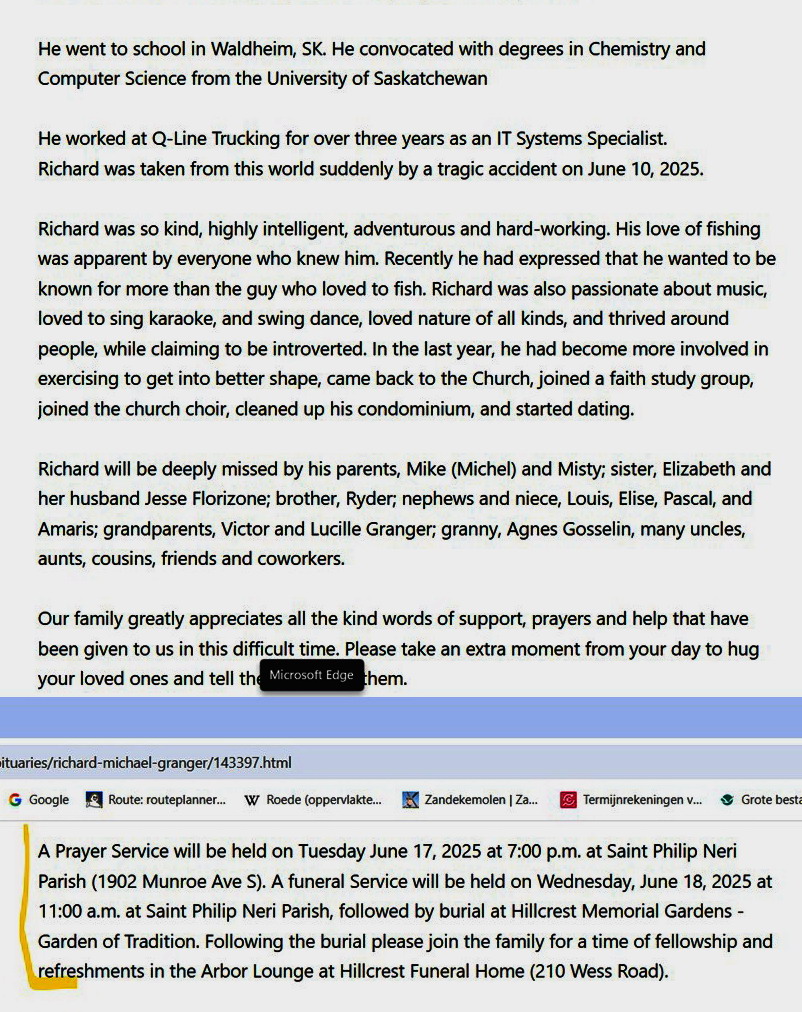 Hij was University degree in Chemistry and Computer Science. Hij werd geboren op vrijdag, 27 september 1996 te Waldheim, Sask., Canada. Hij overleed op dinsdag, 10 juni 2025 te Waldheim, Sask, Canada, in de ouderdom van 28.