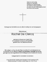 Rachel De Clercq huwde Alexander Desmarets. Rachel De Clercq werd geboren op vrijdag, 4 april 1913 te Veurne. Zij overleed op maandag, 30 april 2007 te Ieper in de ouderdom van 94.