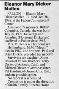 Eleanor Mary Dicker was Homemaker. Zij huwde Moon Mullen; Scan f10272. FALLON. Eleanor Mary Dicker Mullen, 77, died Oct. 26 1998, at the Fallon Convalescent Center.