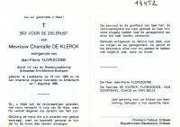 Chantalle De Clerck huwde Jean Pierre Florizoone, zoon van Roger Albert Florizoone en Simonne (Simona) Claus. Chantalle De Clerck werd geboren op donderdag, 19 mei 1960. Zij overleed op maandag, 1 augustus 1988 te Anderlecht in de ouderdom van 28.
