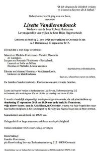 Lisette Vandierendonck werd geboren op dinsdag, 21 mei 1929 te Heist a zee. Zij huwde Robert Florizoone, zoon van Auguste (Augustin) Florizoone en Marie Louise (Augusta) Jonckheere, op 13 september 1947 te Middelkerke. Lisette Vandierendonck overleed op donderdag, 10 september 2015 te Oostende in de ouderdom van 86.