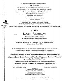 Robert Florizoone was Schilder-Zeewezen. Hij werd geboren op woensdag, 31 augustus 1927 te Nieuwpoort. Hij huwde Denise Corveleyn op 5 mei 1951 te Oostende. Robert Florizoone overleed op vrijdag, 5 mei 1995 te Oostende in de ouderdom van 67.