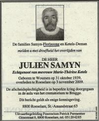 Julien Samyn werd geboren op maandag, 10 oktober 1938 te Woumen. Hij overleed op woensdag, 19 oktober 1938 te Woumen.