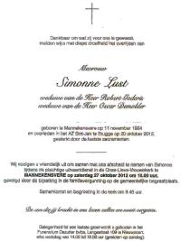 Simonne Lust was Winkelierster. Zij werd geboren op dinsdag, 11 november 1924 te Mannekensvere. Zij huwde Robert Louis Goderis, zoon van Isidoor August Goderis en Lucie Marie Marrannes, op 18 september 1950 te Mannekesvere. Simonne Lust huwde Oscar Benjamin Demolder, zoon van Honoré Bertinus Demolder en Maria (Marie) Ludovica Hancke, op 9 april 1958 te Mannekesvere. Simonne Lust overleed op zaterdag, 20 oktober 2012 te Brugge in de ouderdom van 87.