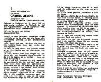 Gabriël Lievens was Timmerman. Hij werd geboren op maandag, 23 maart 1903 te Zedelgem. Hij huwde Martha Leona Cornelia Vandenbruwaene, dochter van Augustus Cornelius Vandenbruwaene en Mathilde Pharailde Florizoone, op 23 mei 1929 te Oeren-Alveringem. Gabriël Lievens overleed op maandag, 26 september 1988 te Torhout in de ouderdom van 85.