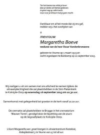 Margaretha (Marguerite) Boeve werd geboren op donderdag, 1 maart 1923 te Veurne. Zij huwde Oscar Vandenbruwaene, zoon van Maurice (Maurits) Cornelius Vandenbruwaene en Antonia Foré, op 23 oktober 1948 te Koksijde. Margaretha (Marguerite) Boeve overleed op donderdag, 10 september 2015 te Bulskamp in de ouderdom van 92.