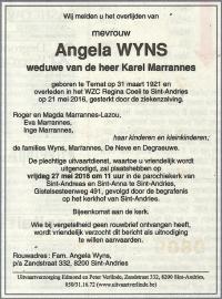 Angela (Angéle) Wyns werd geboren op donderdag, 31 maart 1921 te Ternat. Zij huwde Karel Marrannes, zoon van Louis (Lodewijk) Karel Marrannes en Augusta Valentina Degraeuwe, op 5 mei 1943 te Ternat. Angela (Angéle) Wyns overleed op zaterdag, 21 mei 2016 te Sint Andries in de ouderdom van 95.